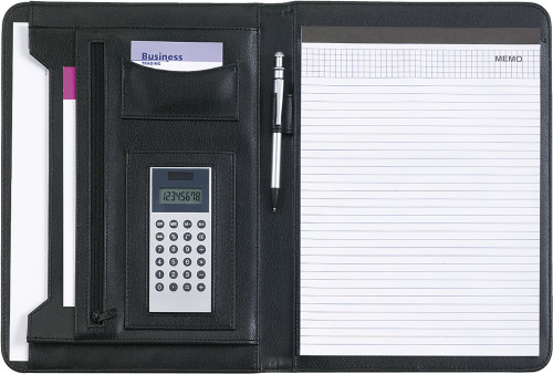 Conférencier A4 en PU livré avec bloc-notes et calculatrice dual power, sans stylo.